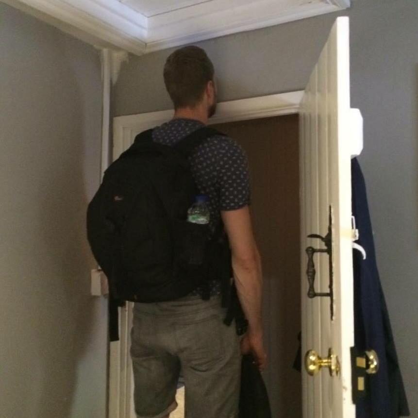 Tall people often bump their heads on doors because the frames are too low. When they walk through a doorway, their head can accidentally hit the top of the door frame, which can be quite uncomfortable. This happens because the doorways are built for average or shorter heights. Thus, taller individuals must be cautious and bend slightly to avoid hitting their heads.