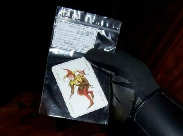 Image source Warner BrosThe Joker’s arrival in 'The Dark Knight' was shown as a teaser at the end of 'Batman Begins', when Batman is given an evidence bag by Jim Gordon. It's a Joker playing card with a written label 'J. Kerr'. This obviously refers to Joe/Joseph Kerr, an infamous alias The Joker uses in the comics.