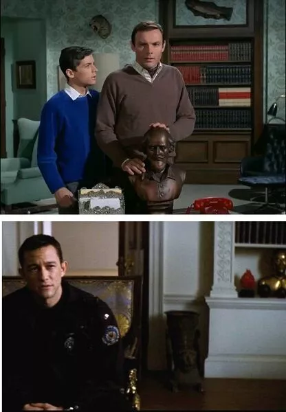 Image source Warner BrosAn old house like Wayne Manor is filled with historic artifacts but when John Blake meets Bruce in 'The Dark Knight Rises' a couple of them are missing, a bronze bust of Shakespeare and a bright red object. Both of these were iconic props from the Adam West TV show, Commissioner Gordon's hotline and a secret entrance to the Batcave.