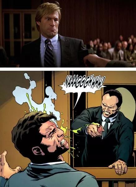 Dark he pulls a gun and almost misses Harvey. This is a signal nod to how Sal classically threw a vial of acid in Harvey’s face during the trial. Clever stuff.