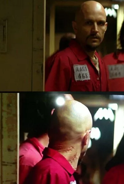 Image source Warner BrosSociopathic serial killer, Victor Zsasz makes a scary cameo in 'Batman Begins' as one of the Falcone thugs that get sent to Arkham and is later freed by Ra’s al Ghul.. Although his bald head is easy to hide, the three 5 tally scars on his neck are clearly visible. Zsasz’s signature feature has always been the scars he marks on his body for each kill he's involved in. It's good to keep a tally!