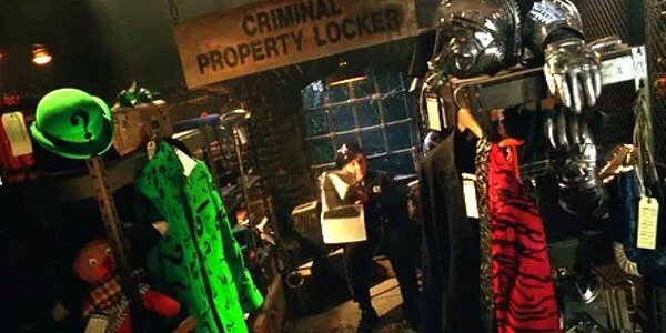 Image source Warner BrosIn 'Batman & Robin', when Bane breaks into Arkham Asylum to retrieve Mr. Freeze’s cryo-suit, he passes by some familiar accessories belonging to Batman's villains - Riddler's green question mark attire and Two Face's 2-tone suit. We also briefly see a clock and wonder if this is the Clock King or the Toyman.