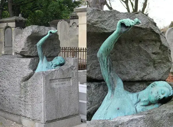 The grave of writer and poet Georges Rodenbach is supposed to be a testament to him 'mocking' death - so much so that he had a statue of himself seemingly climbing out of the grave, as though he can't be contained, and then showing his arm holding up a lone flower.