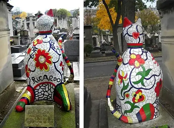 One thing you don't expect to see when walking around a cemetery is a large, colorful ceramic cat. This gravestone, known as Ricardo's Cat, is around 5 feet high and made from mosaic tiles. The cat was created for Ricardo Menon, the artist's assistant, who died and was buried there.
