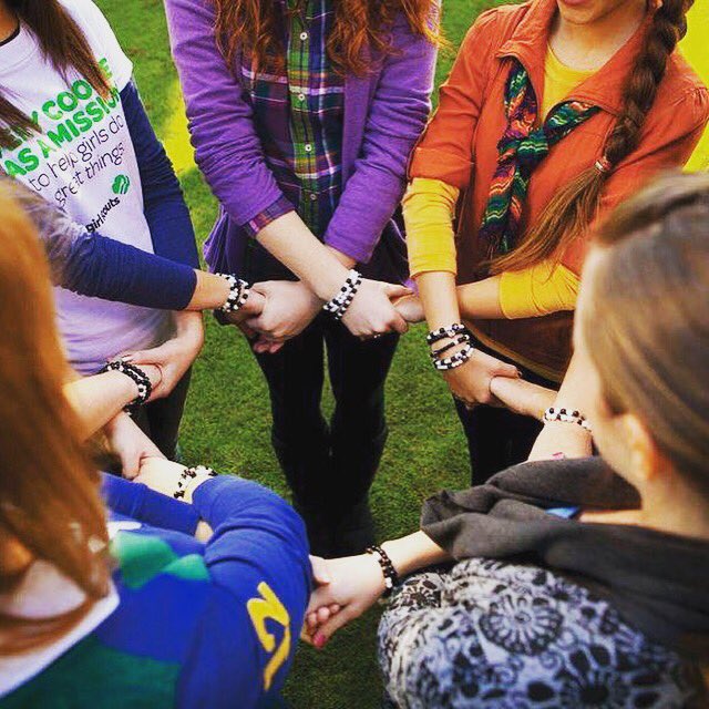 Girl Scouts participate in a Friendship Circle where you stand in a circle and cross your right arm over your neighbors left to clasp hands with friends on both sides. Then, everyone makes a silent wish and a hand squeeze is passed from hand-to-hand around the circle. This is to represent an unbroken chain of friendship.