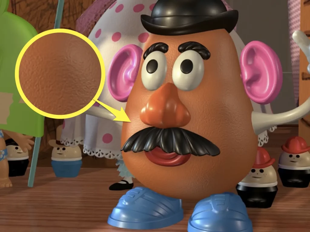 Image source Disney/PixarEach toy in the movie is designed to look like it's made from the same fabric as it would on a human person.  As an example, Mr Potato Head's plastic body appears textured and rough and Woody's clothes look soft and a bit worn.  Slinky Dog's spring is metallic and shiny, very authentic.