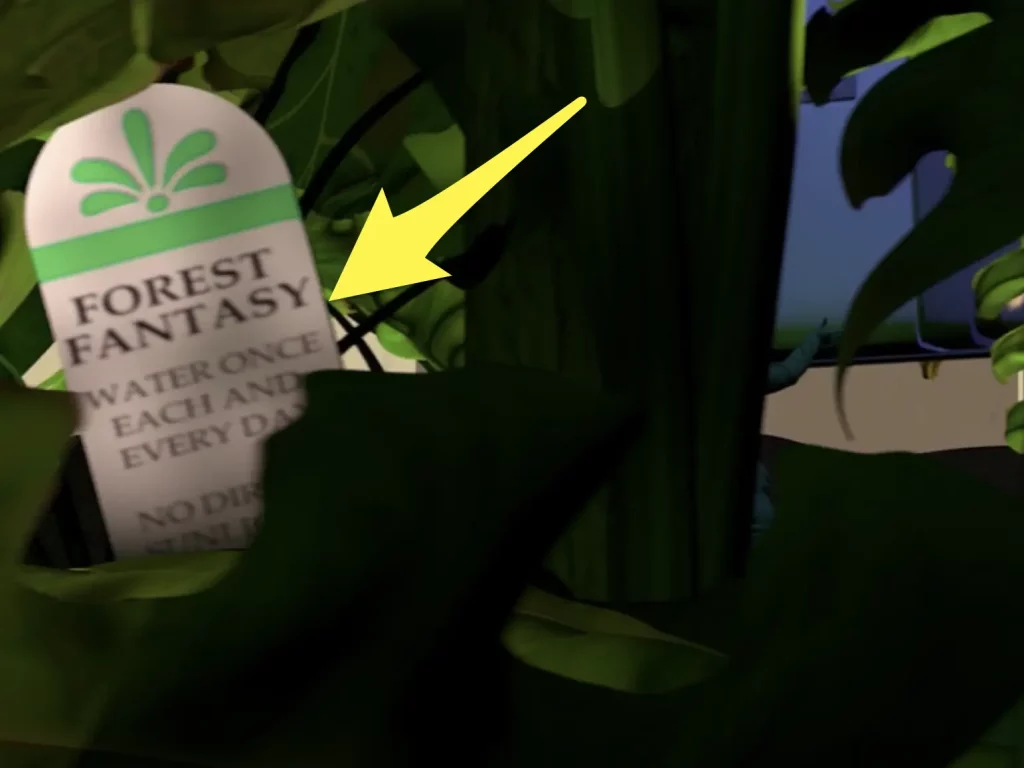 Image source Disney/PixarWhen the toy soldiers hide in a large plant pot during the birthday party, viewers can see that a care tag from the garden store is sticking out of the dirt.  Such attention to detail! Forest Fantasy doesn't appear to be a real nursery but the tag shows realistic and clear instructions for handling the looking after the plant.