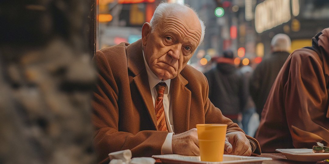 A sad grandfather sitting alone in a restaurant | Source: Midjourney