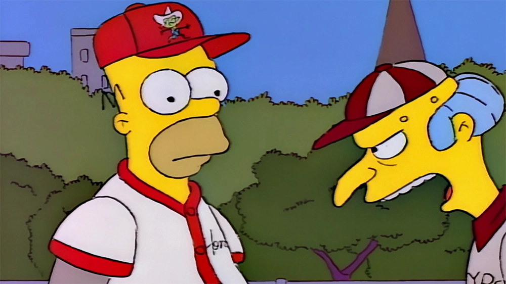 Image source Disney PlusThis is the classic one where Burns places a very large bet on the baseball game. All the players drop out, one by one, leaving Homer as the only one left on the bench. He's brought in as a pinch-hitter and gets hit by the pitch, bringing in the winning run! A totally ridiculous episode, exploiting Homer's dignity but an absolute cracker with the guest voices on the show and the 'mockumentary'!