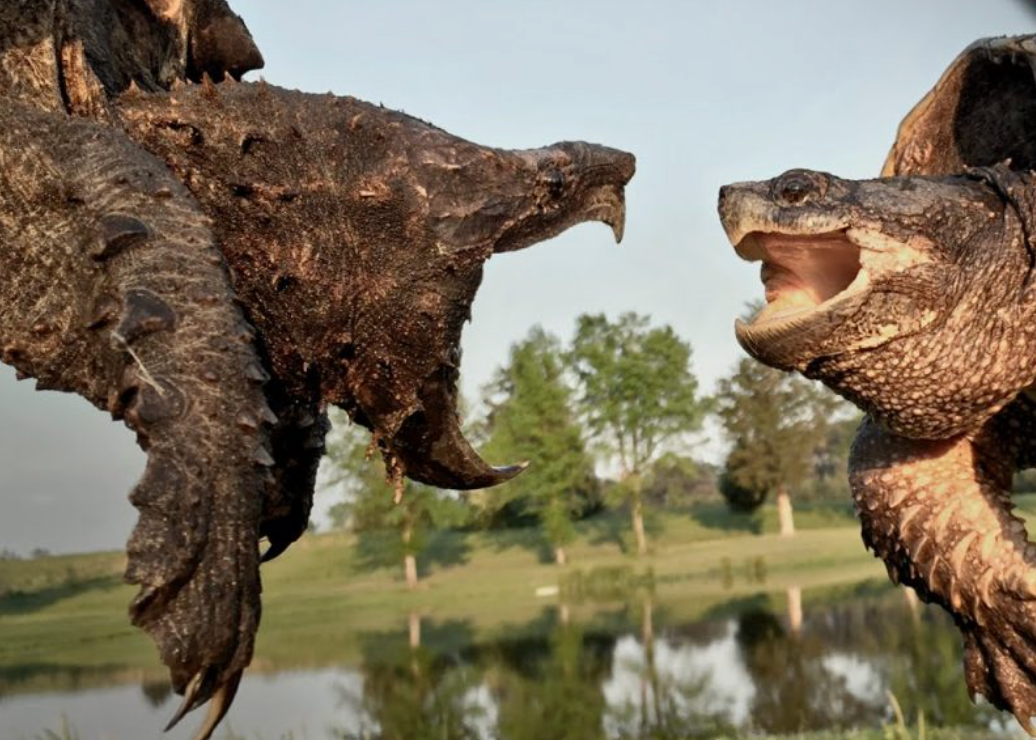 Image source / YouTubeOne of the heaviest freshwater turtles, alligator snapping turtles have such powerful jaws, long, spring-like neck and ridges on the shell which are quite similar to alligators.  With the camouflaged mouth and an appendage on the tip of its tongue, this carnivore turtle lies completely still in the water with its mouth open to lure fishes.