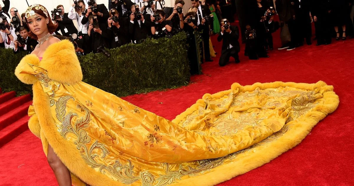 Rihanna's Guo Pei confection from 2015 divided fans and shocked first-hand viewers. The off-the-shoulder fur-trimmed robe had a huge filigree-embroidered train that inspired a ton of memes and was compared to everything from Big Bird to a pizza to an omelet.