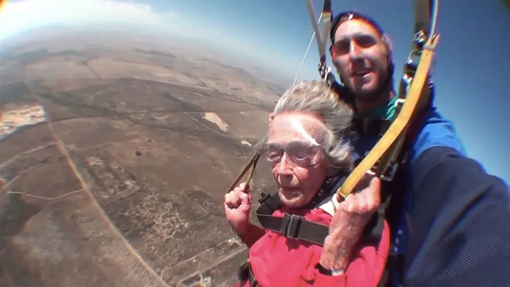 Image source LolWotGeorgina Harwood, a South African woman of 101 years and a great grandmother, doesn't get the thrills she seeks from her great grandchildren so she compensates this with skydiving and shark diving. That was how she celebrated the end of her tenth decade followed by a party with the family - amazing!