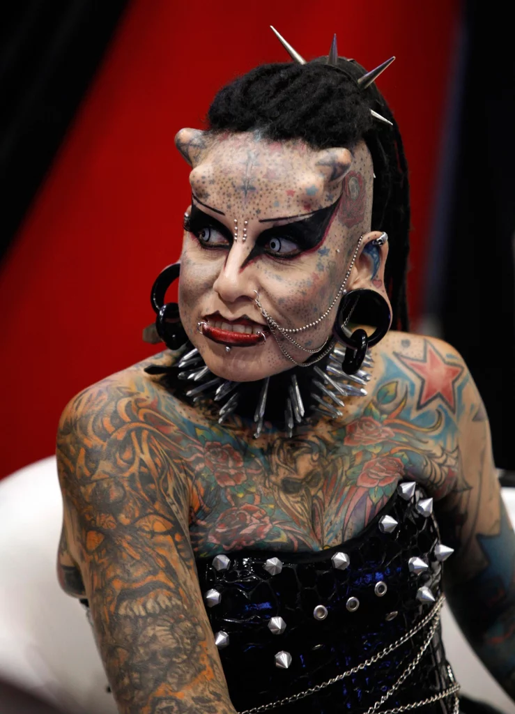 Image source The SunPretty (strange) Mexican Maria Jose Cristerna looks incredibly scary with her tattooed body and numerous piercings, not to mention the unusual hairstyle (which I've often wondered if it would suit me). However, it's the metal horns in her head that probably give her a migraine. Check out the fangs to complete the look. Oh, her profession is as a lawyer and she spends her time helping victims of domestic abuse - don't judge a book ....