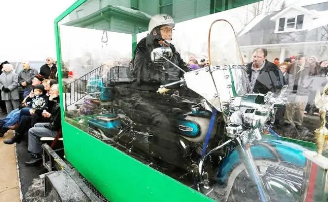Apparently, there are a small minority of Ohio natives who are dressed up for their funeral and travel in the front seat of the hearse.  Billy Standley was so obsessed with his 1967 Electra Glide cruiser that he spent the last few years of his life planning his burial on the motorcycle.  He purchased 3 cemetery plots and designed a Plexiglass acrylic casket.  It took 5 embalmers to prepare Standley for his final ride and they mounted his body on the bike, having dressed him in leather biking gear and a helmet!  He led the procession to his own funeral.