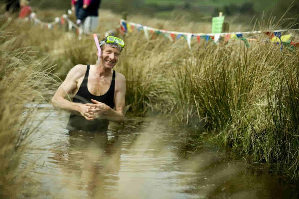 Image source WikimediaThis is a gross type of swimming as you go snorkelling in a marshy bog. The water-filled trench is cut through a peat bog and participants wear snorkels and flippers to wade through the bog. Only snorkelling strokes are permitted and no traditional swimming (as if that would be possible!)