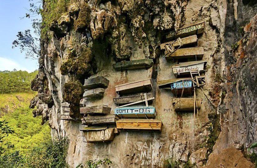 Echo Valley, Sagada is home to the wooden coffins of the indigenous Kankanaey people hanging from the sides of cliffs. The deceased's coffin is either stored in a cave or spectacularly hanging from the rock. It's believed that doing so acts as a spiritual boost for them to reach the afterlife quicker.Advertisement