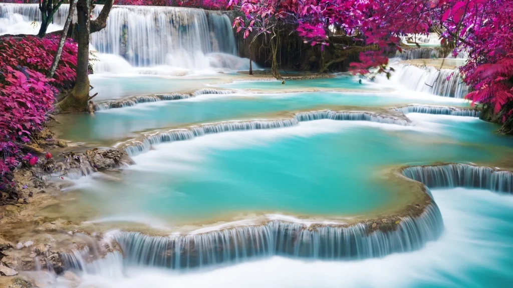 Not many people are familiar with the country Laos, which is nestled between Thailand and Cambodia, but this place looks like something out of a dream…the stunning turquoise blue lagoons, the rushing waterfall and the bright pink flowers create a tropical oasis.