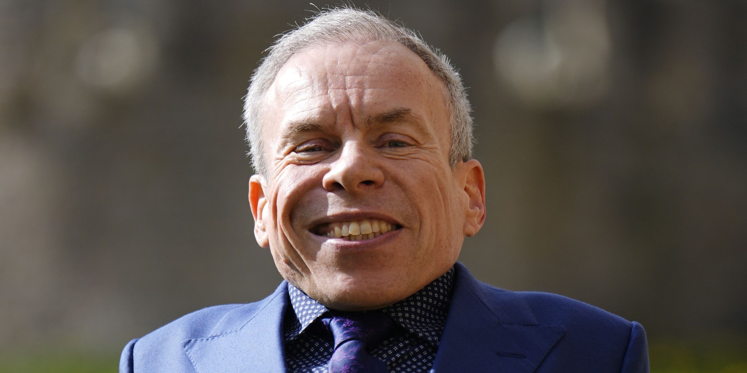 A beaming Warwick Davis poses on the grounds of Windsor Castle following his investiture on 11 March 2026, his OBE medal catching the light against his royal blue suit as the castle's iconic Round Tower rises behind him. The broad smile on his face says everything — this was a day four decades in the making, honouring a career that has taken him from a galaxy far, far away to the corridors of Hogwarts and beyond.